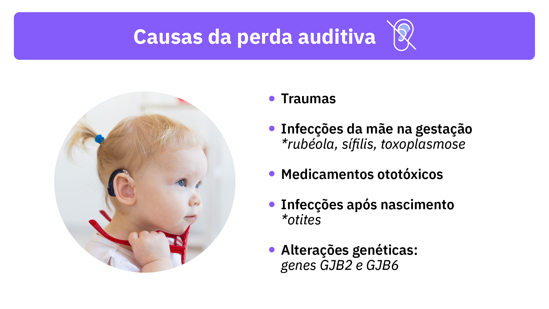 | A surdez, que pode ser total ou parcial, apresenta causas complexas, que incluem a influência de fatores genéticos e ambientais ou a junção de ambos. Fatores ambientais que podem levar à perda auditiva incluem infecções que a mãe teve durante a gestação, como rubéola, toxoplasmose e sífilis. Além disso, infecções após o nascimento (como otites recorrentes), traumas na região da cabeça e uso de determinados medicamentos ototóxicos também podem levar à surdez. |