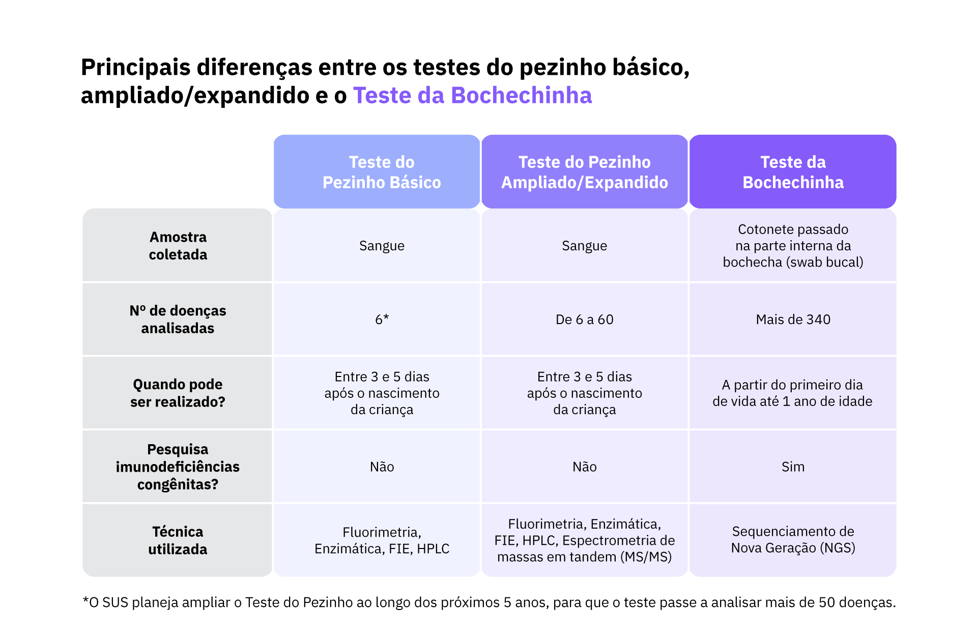 O Teste da Bochechinha investiga mais de 340 doenças tratáveis que se iniciam na infância. Com o objetivo de “triar para tratar”, o Teste da Bochechinha proporciona a detecção precoce do risco, aumentando as chances de um tratamento mais eficiente.