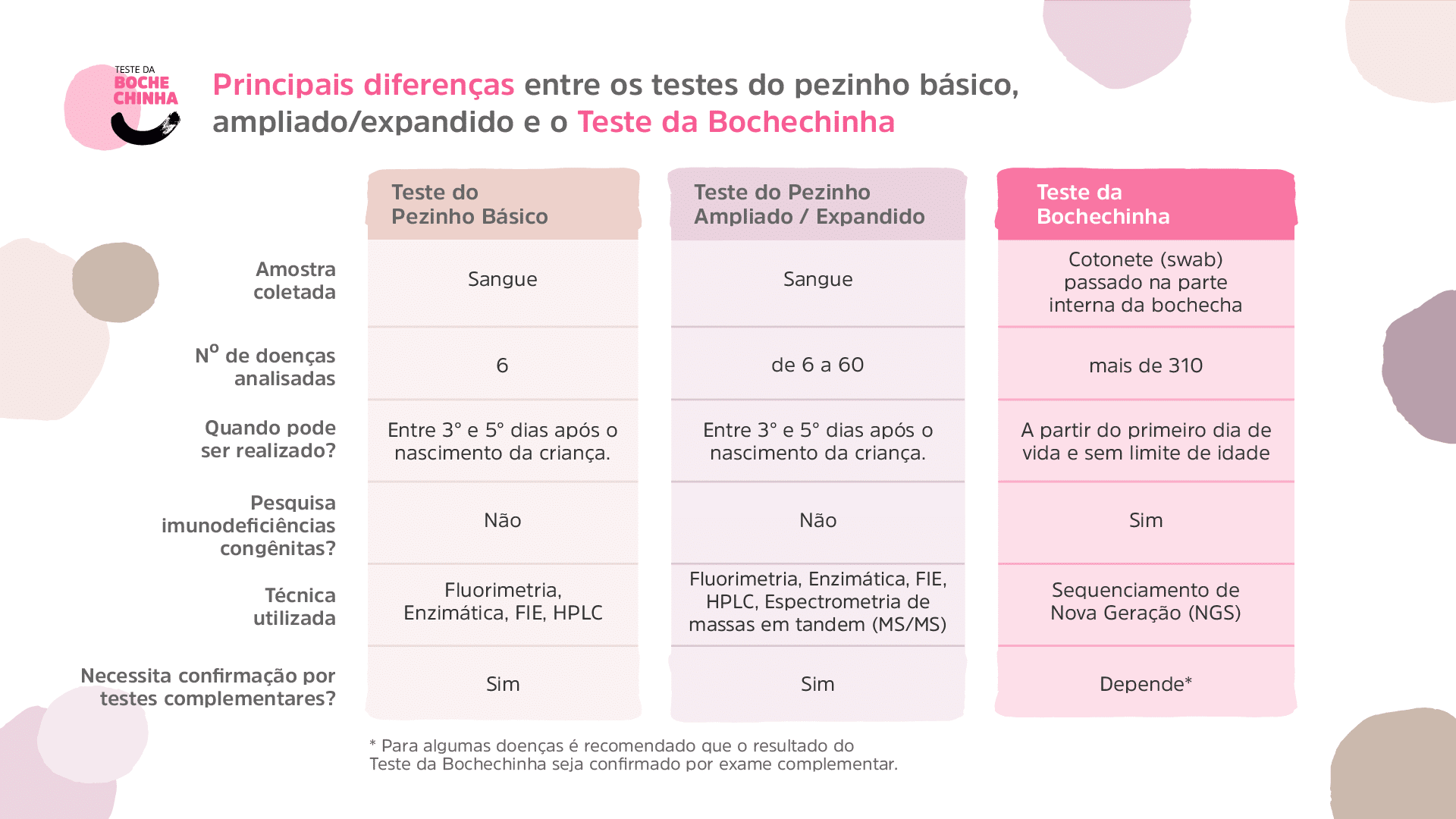O Teste da Bochechinha investiga mais de 340 doenças genéticas que se manifestam na infância, sendo o teste de triagem neonatal genético mais avançado no mercado. Doenças de causa não genética que podem estar inclusas em testes bioquímicos, como as versões ampliadas do Teste do Pezinho, portanto, não são investigadas. Por isso o Teste da Bochechinha complementa o Teste do Pezinho.