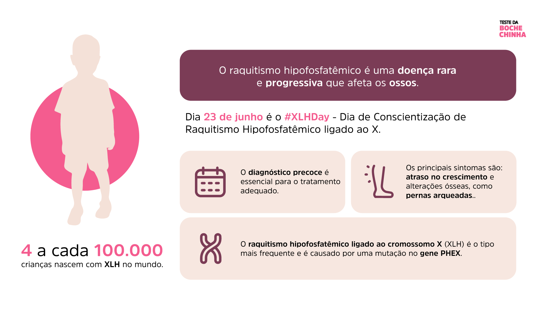 O XLH é uma das mais de 340 doenças triadas pelo Teste da Bochechinha, o primeiro teste de triagem neonatal genético do Brasil, e o único que tria raquitismo hipofosfatêmico ligado ao X.
