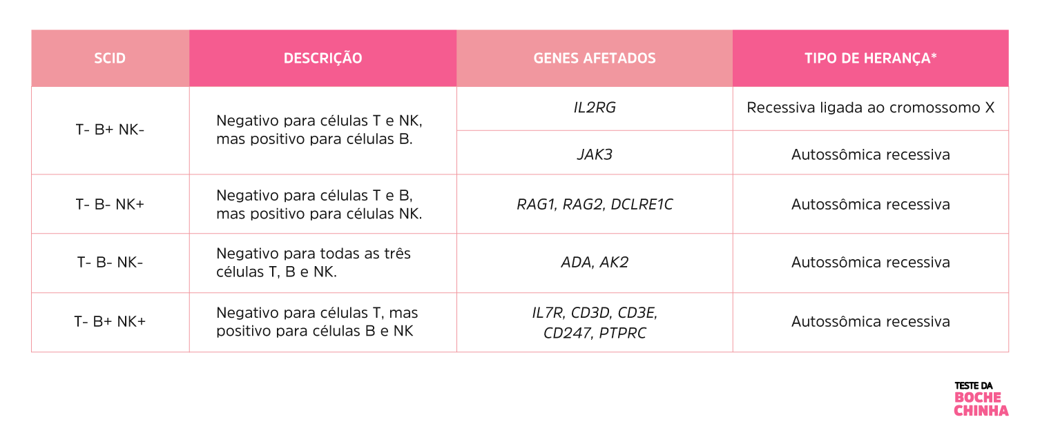O tipo de SCID vai depender de quais genes estão alterados mas, de maneira geral, as doenças afetam o funcionamento das células T e pelo menos mais uma outra célula do sistema imunológico. Por isso é chamada de imunodeficiência combinada.
