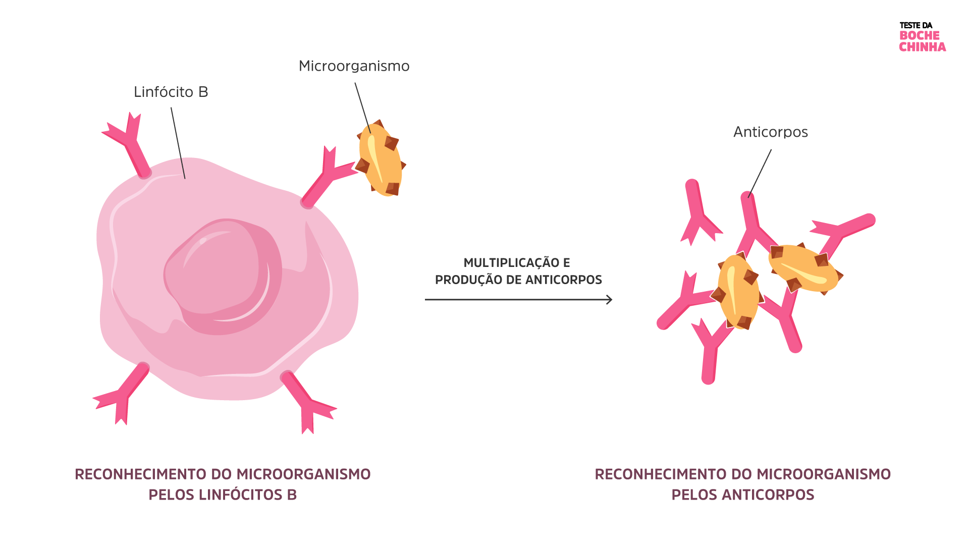 Ilustração de como são formados os anticorpos a partir do reconhecimento de um microorganismo pelos linfócitos B.
