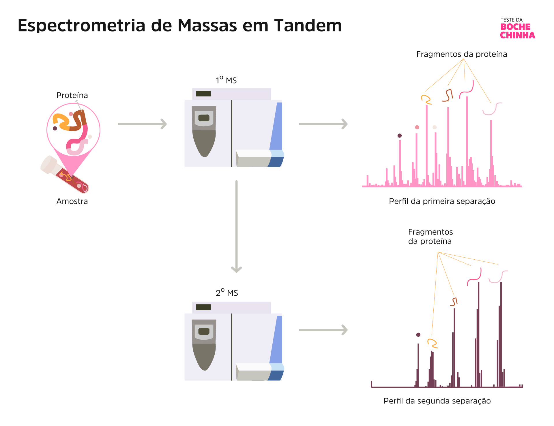 Figura 1. Esquema ilustrativo do funcionamento da espectrometria de massas em tandem na identificação e quantificação de uma proteína em amostra de sangue. A proteína é quebrada em diversos fragmentos que são selecionados por tamanho e composição no primeiro aparelho MS. Esses fragmentos passam por uma outra etapa de fragmentação em um segundo aparelho MS. Assim os fragmentos formam um perfil único que permite identificar a proteína.