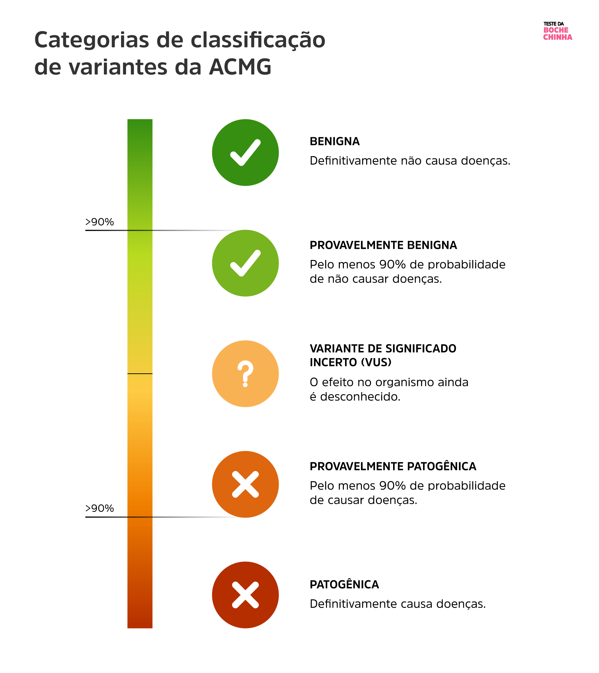 O Colégio Americano de Genética Médica (ACMG) definiu 5 categorias para as variantes genéticas: benignas (que definitivamente não causam doenças), provavelmente benignas (que provavelmente não causam doenças), de significado incerto (que tem efeito desconhecido), provavelmente patogênicas (que provavelmente causam doença) e patogênicas (que definitivamente causam doenças).
